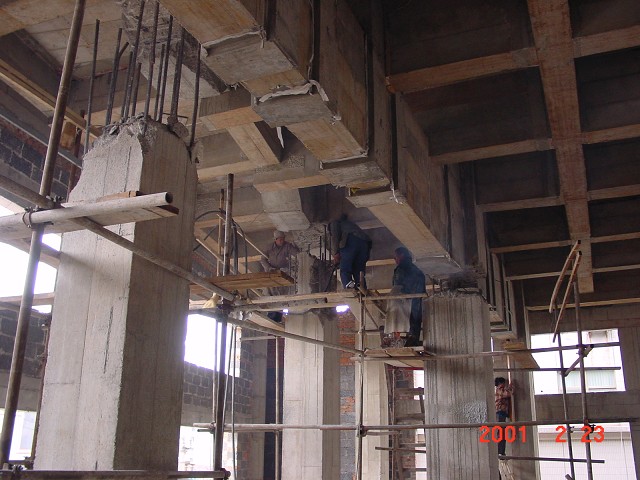 濟南勝利石油大廈,原辦公室改為大會議室,抽三根框架柱,采用上翻預(yù)應(yīng)力梁結(jié)合腹板柱空腹桁架轉(zhuǎn)換結(jié)構(gòu)進行加固改造處理,既滿足了安全要求,又滿足了使用功能的改變。