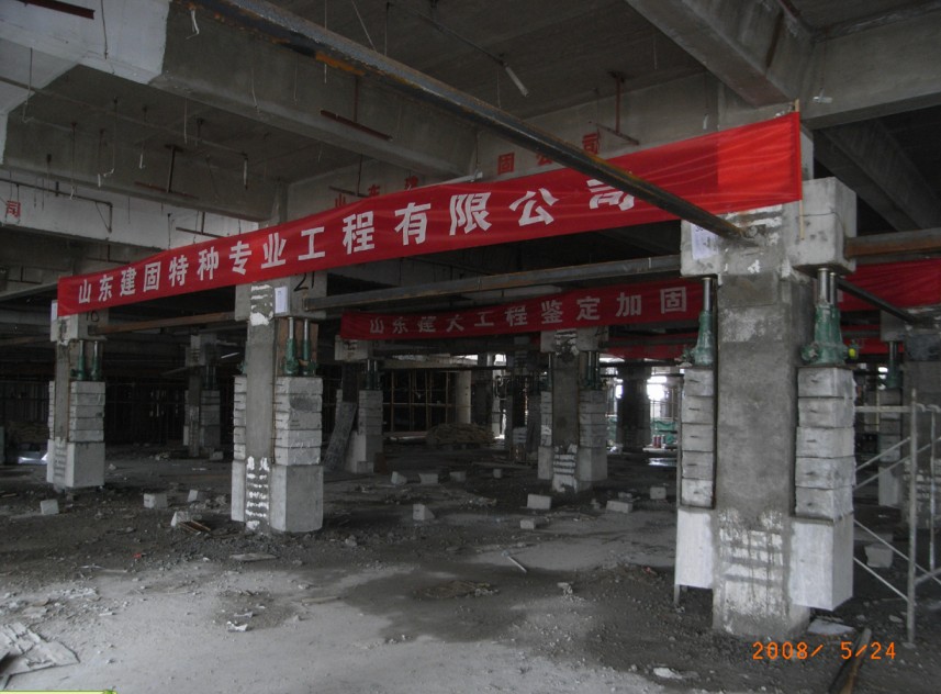 濟寧銀座商場(原華聯(lián)商廈)二期,為四層(局部六層)框架結構,建于1992年。原設計該建筑物的四層和五層層高為2.9m,現(xiàn)已不能滿足使用要求,每層需整體抬升1.1m。