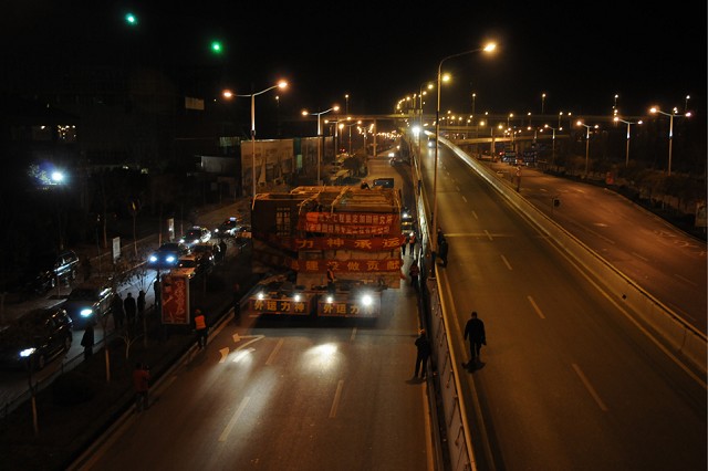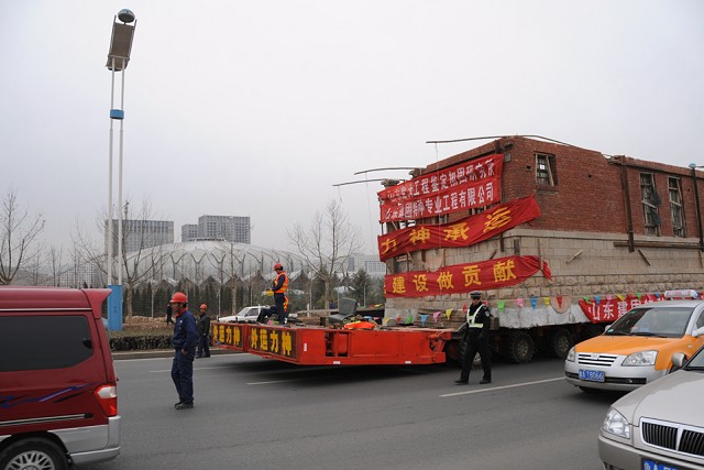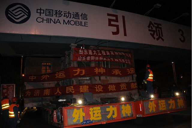 該建筑原位于繁華市區(qū),為了盡量減輕道路交通壓力, 對(duì)運(yùn)輸線路進(jìn)行了詳細(xì)勘察,遷移于3月1日21:38分開始,遷移過程中,老別墅四次屈身過街天橋,三過立交,于3月2日11:43安全到達(dá)山東建筑大學(xué)新校區(qū)。整個(gè)遷移過程歷時(shí)14小時(shí),遷移距離為30公里。
