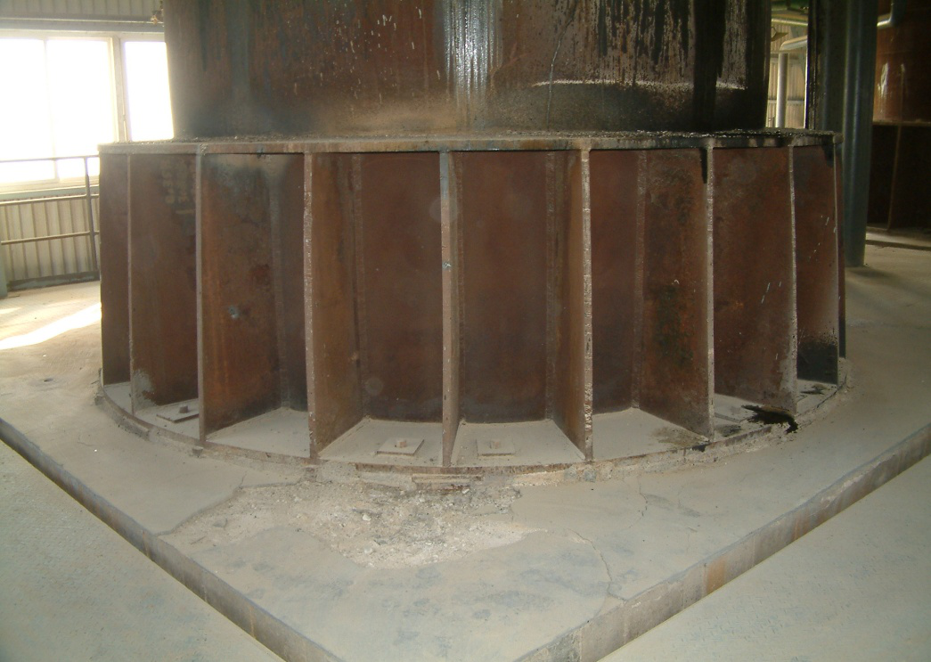 某礦業(yè)公司重?zé)G基礎(chǔ)采用鋼筋混凝土框架結(jié)構(gòu),框架底部為筏板,底標(biāo)高為-3.50m,其上置方形鋼筋混凝土柱。頂部為一厚1.40m由耐熱混凝土澆筑的平臺(tái),平臺(tái)頂面標(biāo)高為12.00m,中央為一半徑為1.73m的圓孔,重近400t豎窯即通過加肋環(huán)形鋼托盤支撐于平臺(tái)圓孔周邊混凝土頂面(圖1)。