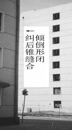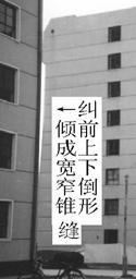 采用掏土灌水法設(shè)計(jì)施工的該項(xiàng)工程,糾傾工作共進(jìn)行了2個(gè)月。各觀測(cè)點(diǎn)傾斜值全部已回至規(guī)范要求范圍,內(nèi)外縱墻原有裂縫大部分已閉合。從糾傾前照片可以看出,傾斜樓房山墻與鄰近參照建筑物墻體間在垂直方向上形成了上寬下窄的倒錐形縫,糾傾后建筑物與參照建筑物間的倒錐形縫已閉合(圖2)。
