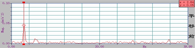平移前的測試結(jié)果:根據(jù)實(shí)測的實(shí)時譜曲線,平移前二層樓面振動測點(diǎn)的主頻為2.84HZ(振動周期0.35s)。