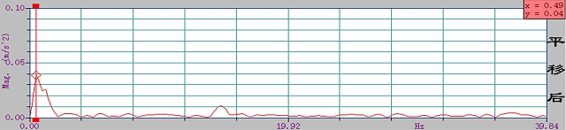 平移后的測試結(jié)果:根據(jù)實(shí)測的實(shí)時譜曲線,平移后二層樓面振動測點(diǎn)的主頻為0.49HZ(振動周期2.04s)。