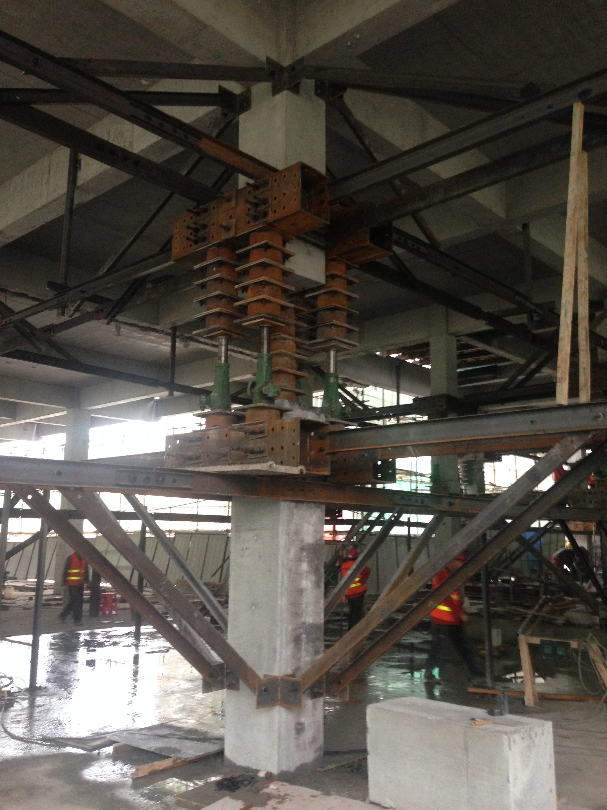 泰安某廣場沿街建筑,地下一層,地上二層,混凝土框架結(jié)構(gòu),占地面積5000平方米,上部結(jié)構(gòu)分為四個(gè)獨(dú)立單體,見圖5。建筑物主體完工時(shí)發(fā)現(xiàn),由于某些原因,一層層高超出了規(guī)劃層高1.1米,需要恢復(fù)至規(guī)劃層高。建設(shè)單位會(huì)同我單位在進(jìn)行了拆除重建、移位等多種的方案的安全、經(jīng)濟(jì)與工期的對(duì)比后,委托我單位進(jìn)行豎向移位的設(shè)計(jì)與施工。