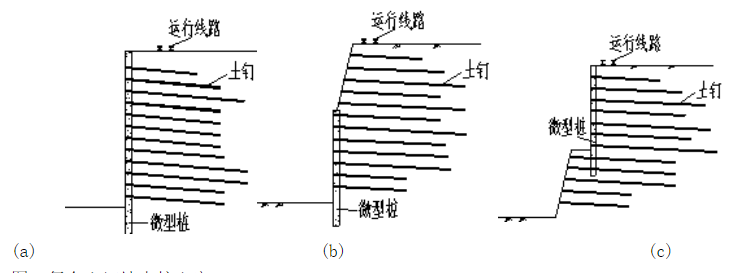 考慮到工程場(chǎng)地周邊條件(南側(cè)緊靠運(yùn)行線(xiàn)路)和地質(zhì)條件(上部填土較厚),考慮到工程對(duì)安全、工期和經(jīng)濟(jì)的要求,綜合考慮決定采用微型樁+土釘錨桿的復(fù)合土釘墻支護(hù)方案。這種形式的復(fù)合土釘墻有三種類(lèi)型,不同工程技術(shù)人員對(duì)不同方案表達(dá)了支持意見(jiàn),現(xiàn)分述如下: