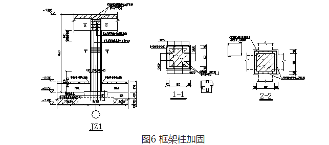 現(xiàn)場(chǎng)檢測(cè)發(fā)現(xiàn),車庫(kù)上浮導(dǎo)致柱開裂且絕大部分柱產(chǎn)生了受壓區(qū)混凝土壓碎現(xiàn)象,柱發(fā)生受壓破壞,故采用加大截面方法對(duì)車庫(kù)內(nèi)55棵框架柱進(jìn)行加固。原柱每邊外擴(kuò)10cm,增設(shè)豎向鋼筋及箍筋,采用高強(qiáng)免振搗灌漿料澆筑,見(jiàn)圖6。