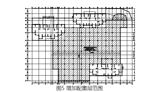 根據(jù)建筑完工后總平面中的場(chǎng)地最低點(diǎn),抗浮設(shè)計(jì)水頭按4.5m對(duì)車庫(kù)部分結(jié)構(gòu)進(jìn)行復(fù)核驗(yàn)算,復(fù)核驗(yàn)算內(nèi)容包括整體抗浮計(jì)算和局部抗浮計(jì)算。結(jié)合驗(yàn)算結(jié)果及現(xiàn)場(chǎng)檢測(cè)情況,在車庫(kù)現(xiàn)有地面上增設(shè)20cm厚混凝土層,如圖5中陰影所示。