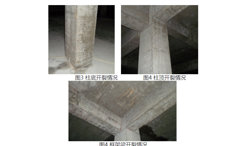 我院技術(shù)人員于2013年7月赴現(xiàn)場(chǎng)進(jìn)行了檢測(cè),檢測(cè)結(jié)果表明,車庫(kù)中心位置上浮位移值最大,上浮后柱底最大高層超過(guò)20cm。框架柱在上浮位移產(chǎn)生的附加軸力及附加彎矩的作用下,產(chǎn)生了開裂及壓碎現(xiàn)象(圖3、圖4)??蚣芰憾藗?cè)面部出現(xiàn)了剪切斜裂縫、梁端底部出現(xiàn)水平裂縫(圖5),特別是車庫(kù)與高層住宅交界位置,梁端開裂較為明顯。在車庫(kù)頂梁板與車庫(kù)外周擋土墻交界位置處附加彎矩的作用下,除梁端裂縫外,擋土墻在梁底標(biāo)高以下位置出現(xiàn)通長(zhǎng)水平裂縫。沿車庫(kù)平面跨中位置車庫(kù)平面縱向,車庫(kù)頂板出現(xiàn)兩條通長(zhǎng)裂縫;車庫(kù)入口處沿車庫(kù)平面橫向,車庫(kù)頂板同樣出現(xiàn)兩條通長(zhǎng)裂縫,頂板裂縫均與上浮位移較大軸線相對(duì)應(yīng)。