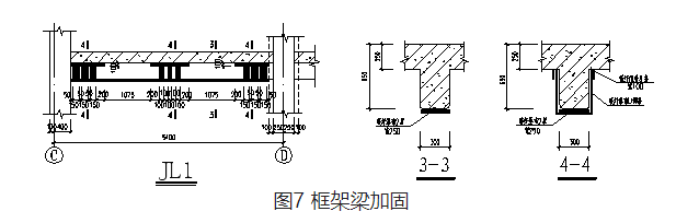 車庫(kù)頂梁破壞情況較輕,灌縫后采用粘貼碳纖維加固方法加固,對(duì)產(chǎn)生斜裂縫的梁在梁端增設(shè)碳纖維U形箍加固,對(duì)梁底出現(xiàn)受拉裂縫的梁在梁底粘貼碳纖維加固,見(jiàn)圖7。