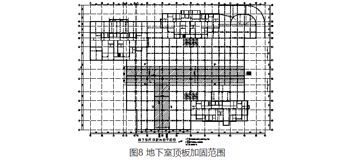 車庫(kù)頂板東西向存在兩條通長(zhǎng)大裂縫,南北向也有兩條較長(zhǎng)裂縫。將裂縫區(qū)域的板加厚10cm,即在板頂增設(shè)10cm鋼筋混凝土層,對(duì)板進(jìn)行加固,同時(shí)提高梁端截面的承載力,加固范圍見(jiàn)圖8。對(duì)底部開裂的板,灌縫后采用粘貼碳纖維方法進(jìn)行加固。