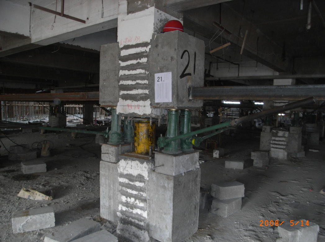 濟(jì)寧銀座購(gòu)物廣場(chǎng)(原濟(jì)寧華聯(lián)商廈)二期工程,為五層(局部六層)框架結(jié)構(gòu),建于1992年。該建筑物的四層和五層原設(shè)計(jì)為倉(cāng)庫(kù)用房,層高為2.9m,面積共計(jì)約2500㎡,現(xiàn)業(yè)主單位決定將四層和五層改造成商場(chǎng)經(jīng)營(yíng)空間,層高不滿足使用要求,委托我公司對(duì)四層、五層進(jìn)行加高改造處理。本著建設(shè)節(jié)約型社會(huì)、打造精品工程的宗旨,我公司與業(yè)主方研究決定采用整體頂升技術(shù)對(duì)四層、五層進(jìn)行抬升改造,每層抬高1.25m。該工程于2008年4月5日開(kāi)工,2008年6月15日完工。